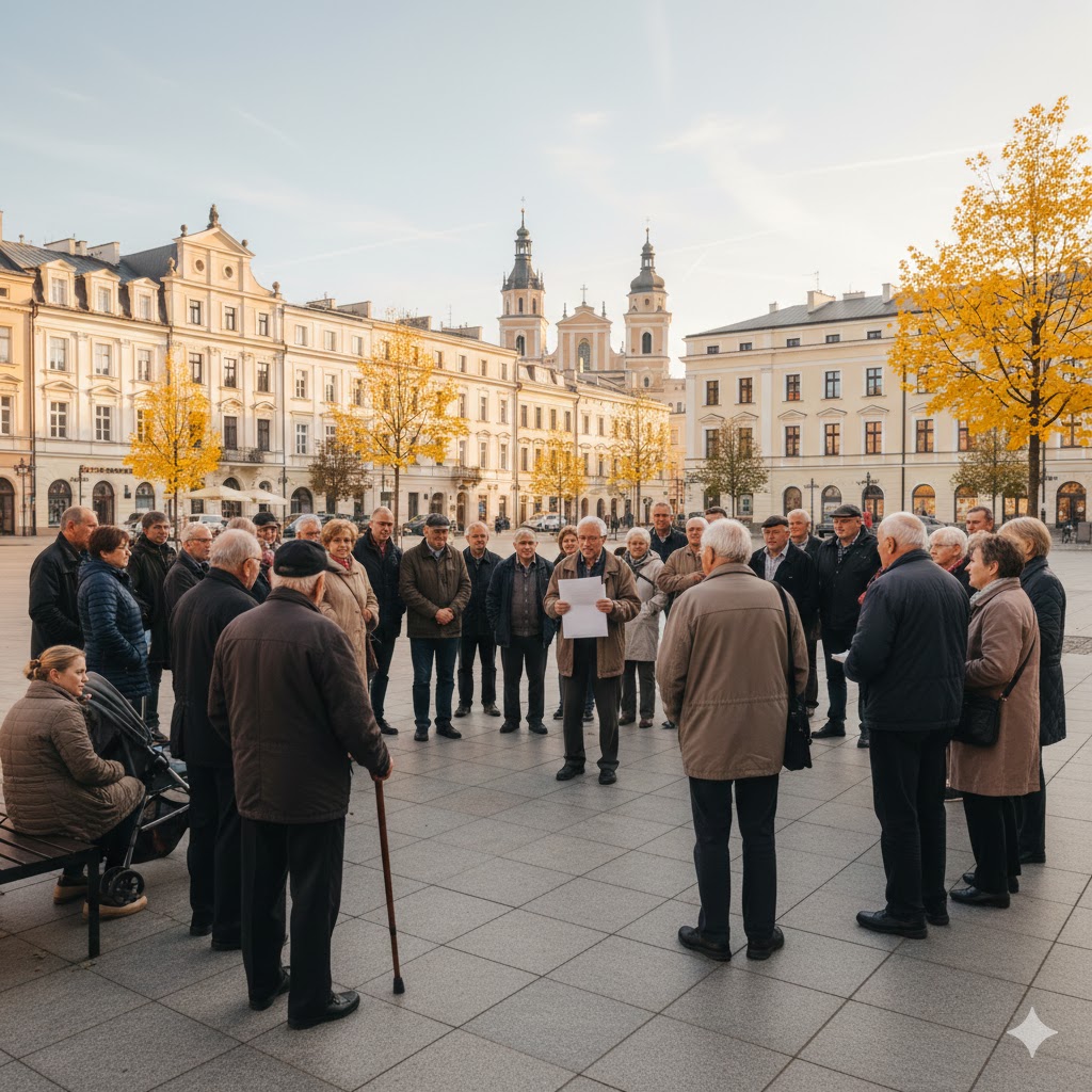 Październikowe słońce bezlitośnie obnażyło problem, o którym my, starsi mieszkańcy Olkusza, mówimy od dawna. Podczas niedzielnego spaceru na Rynku, zorganizowanego przez lokalne stowarzyszenie miłośników historii, znów powrócił temat braku naturalnego cienia i nadmiaru kamiennych płyt. Wydarzenie zgromadziło blisko pięćdziesiąt osób, w tym architektów i seniorów pamiętających dawne, zielone planty.